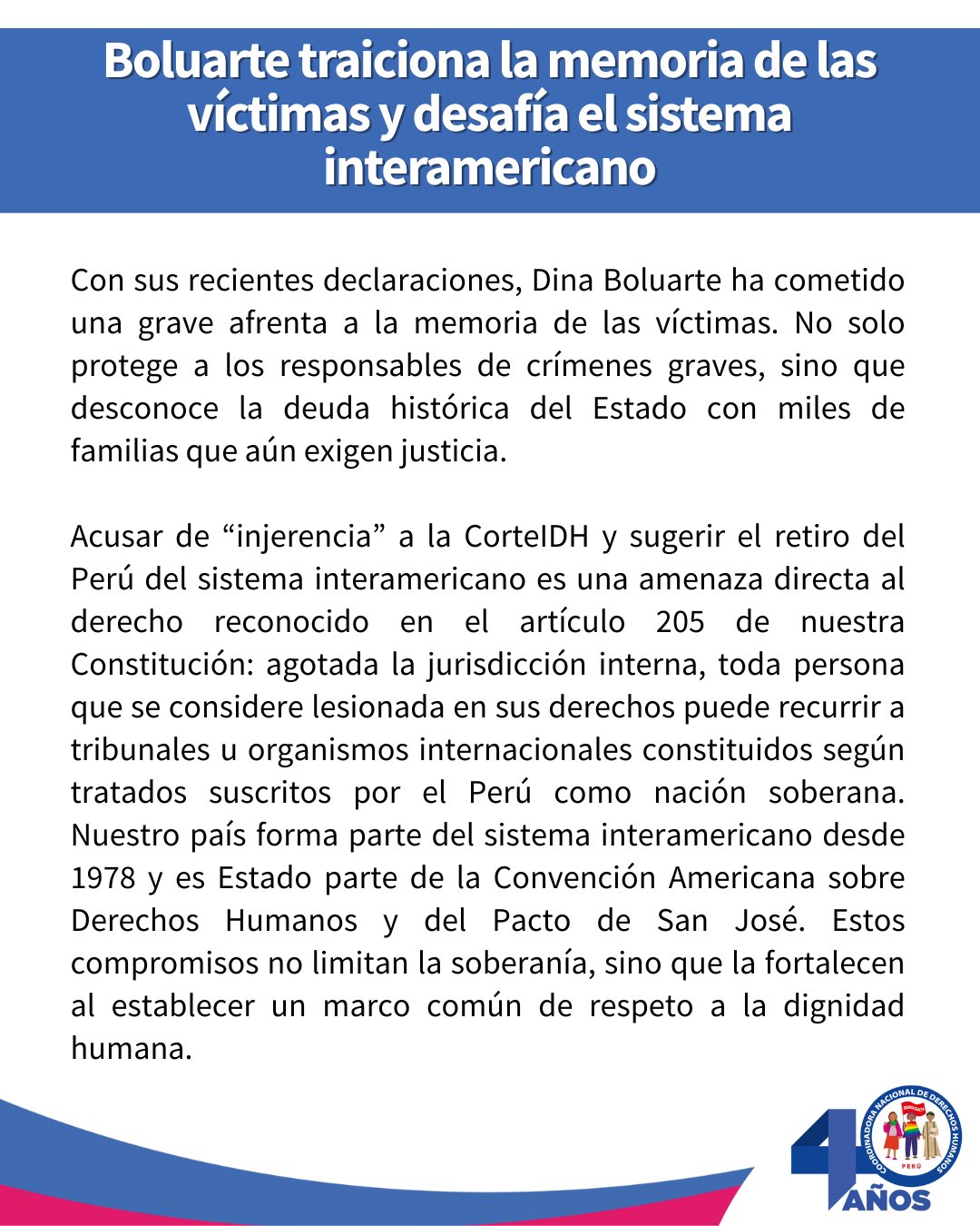 La Coordinadora Nacional de Derechos Humanos (CNDDHH) calificó de traición la nueva postura de Dina Boluarte quien en 2022 acudió al Sistema Interamericano de Derechos Humanos para solicitar medidas cautelares a su favor.